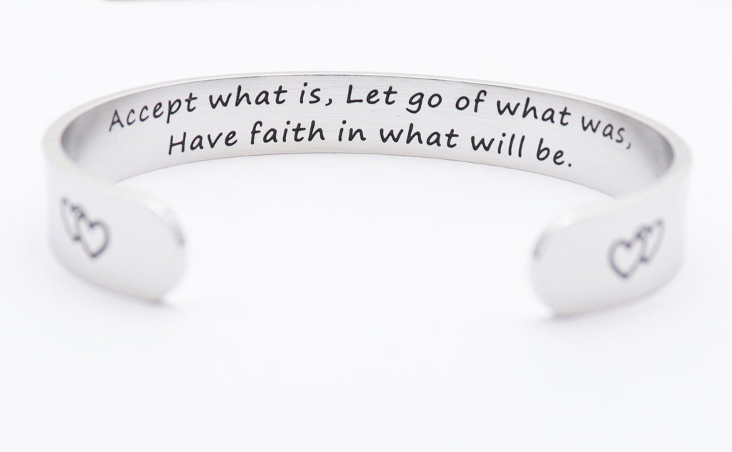 "Accept what is, Let go of what was, Have faith in what will be." Secret Message Cuff Bracelet